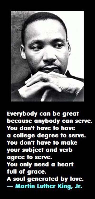 “Everybody can be great…because anybody can serve. You don’t have to have a college degree to serve. You don’t have to make your subject and verb agree to serve. You only need a heart full of grace. A soul generated by love.”